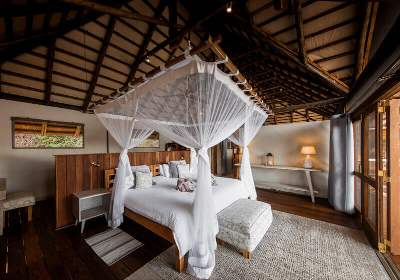 Lodgens fem stilfulla sviter (inklusive en familjesvit med två sovrum och två badrum) är inredda med naturmaterial som går i jordnära färger. Alla rum har en stor bekväm säng med sänghimmel av moskitnät och stora panoramafönster. Badrummen med badkar är utomhus och har utsikt över floden.