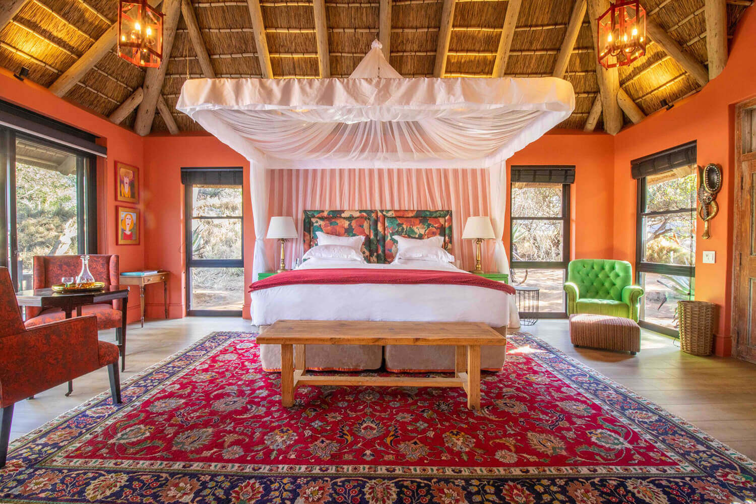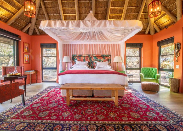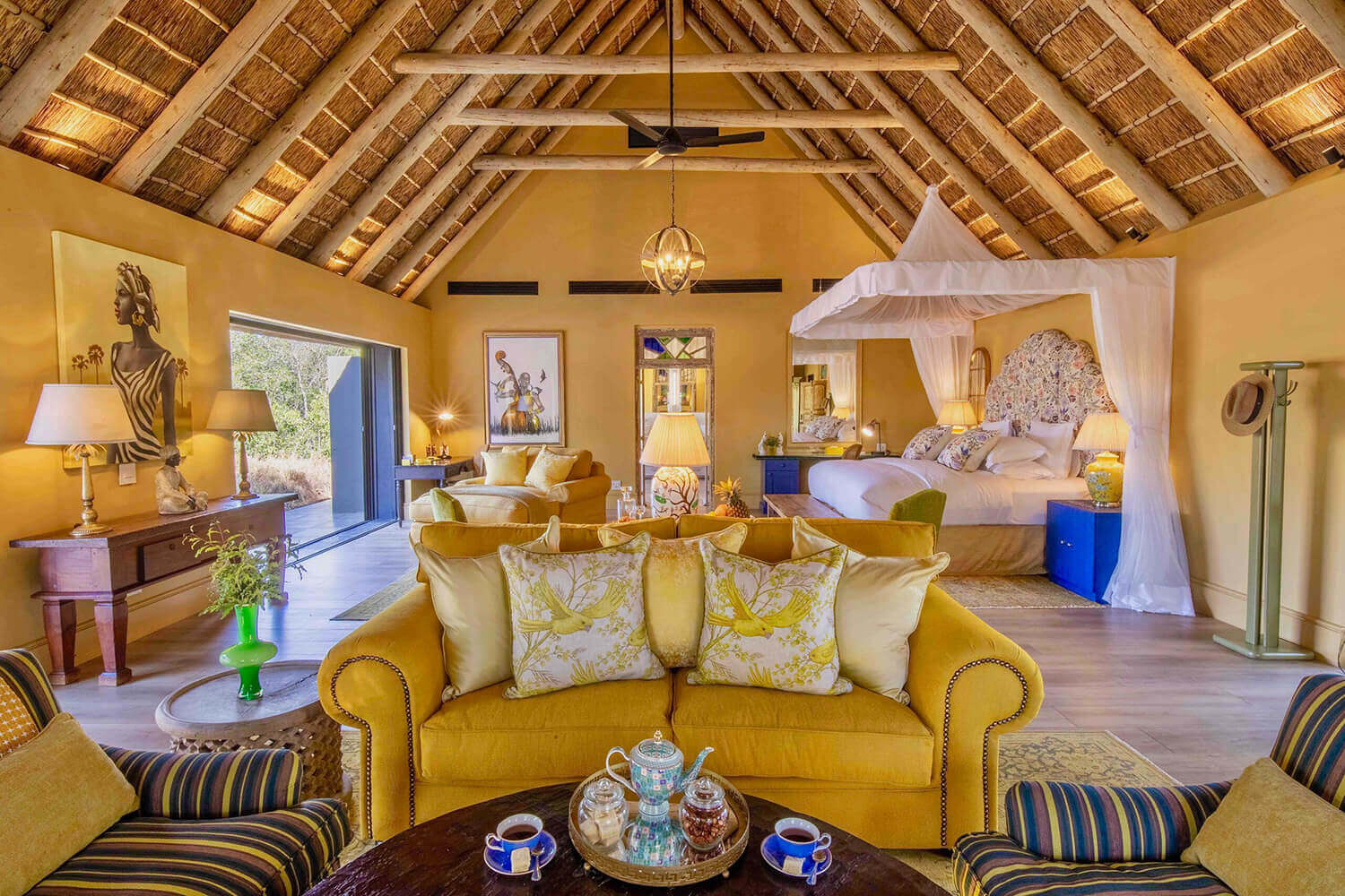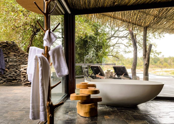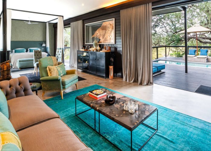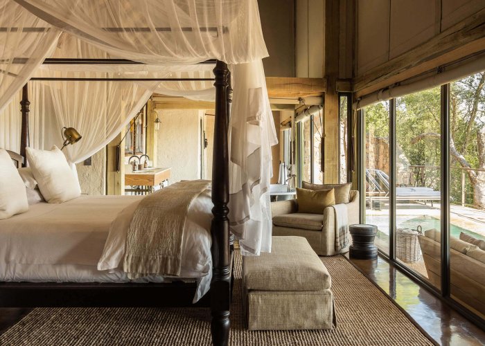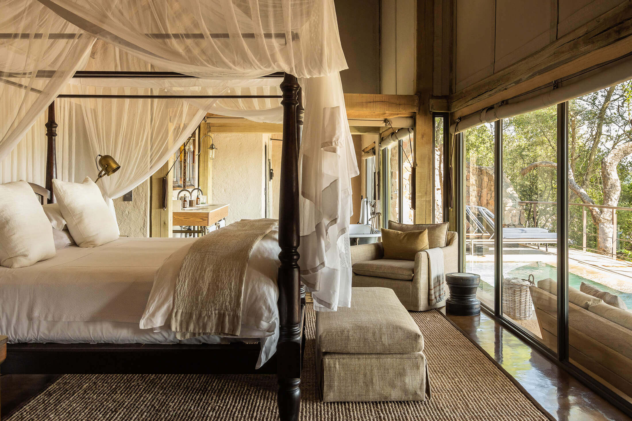 Lodgen består av tolv rymliga sviter med spatiösa vardagsrum och sovrum i öppen planlösning samt badrum med såväl inne- som utedusch. Inredningen går i samma sobra kolonialstil och återfinns i möblemang, konst och textilier. Allt går i diskreta jordfärger med inslag av klara kulörer. Utanför väntar din veranda som är utrustad med plungepool och utsikt över Sand River.