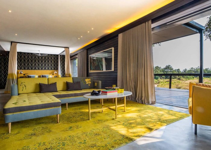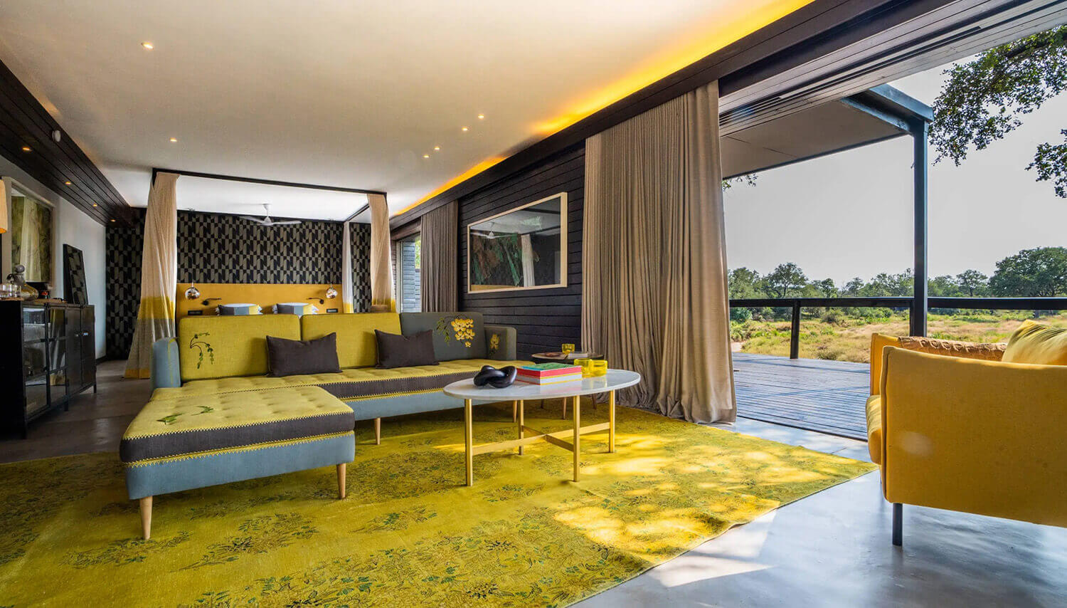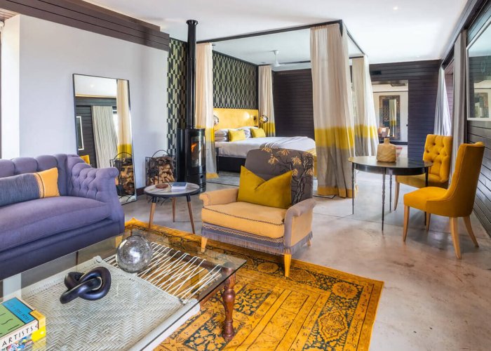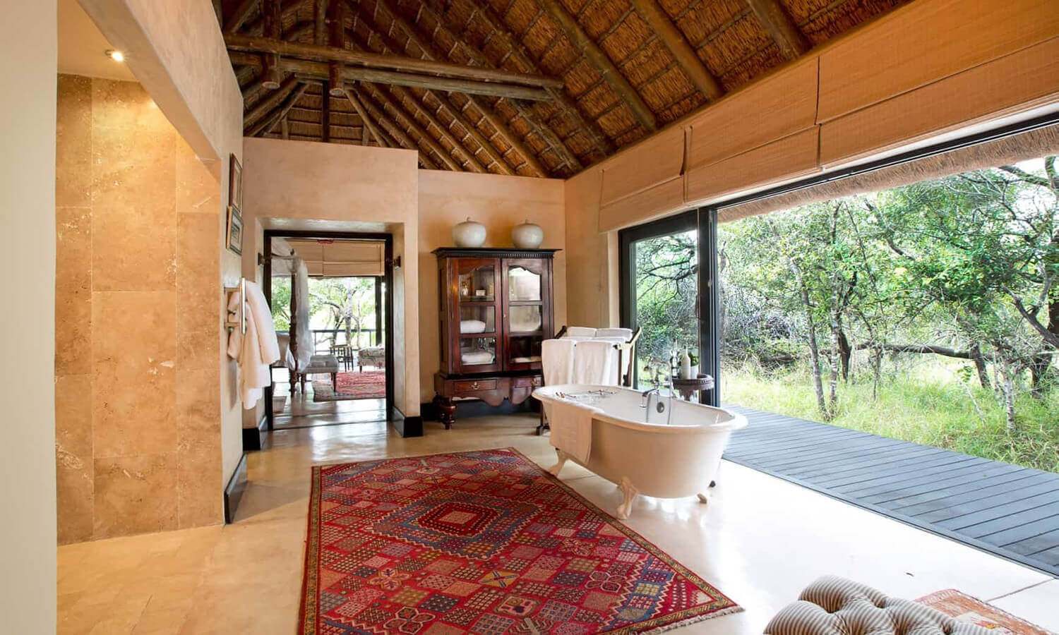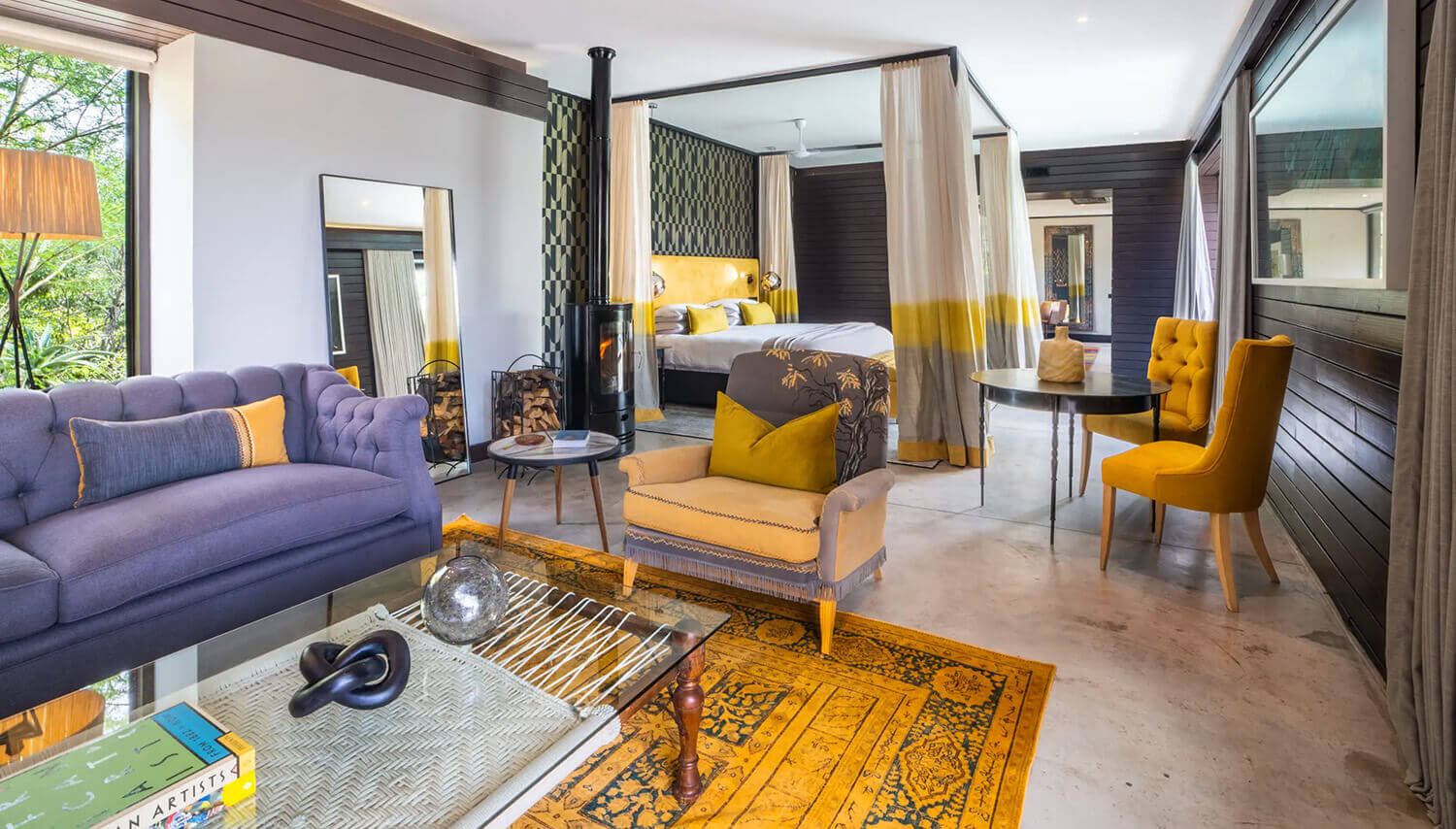 Lodgen består av tolv rymliga sviter med spatiösa vardagsrum och sovrum i öppen planlösning samt badrum med såväl inne- som utedusch. Inredningen går i samma sobra kolonialstil och återfinns i möblemang, konst och textilier. Allt går i diskreta jordfärger med inslag av klara kulörer. Utanför väntar din veranda som är utrustad med plungepool och utsikt över Sand River.