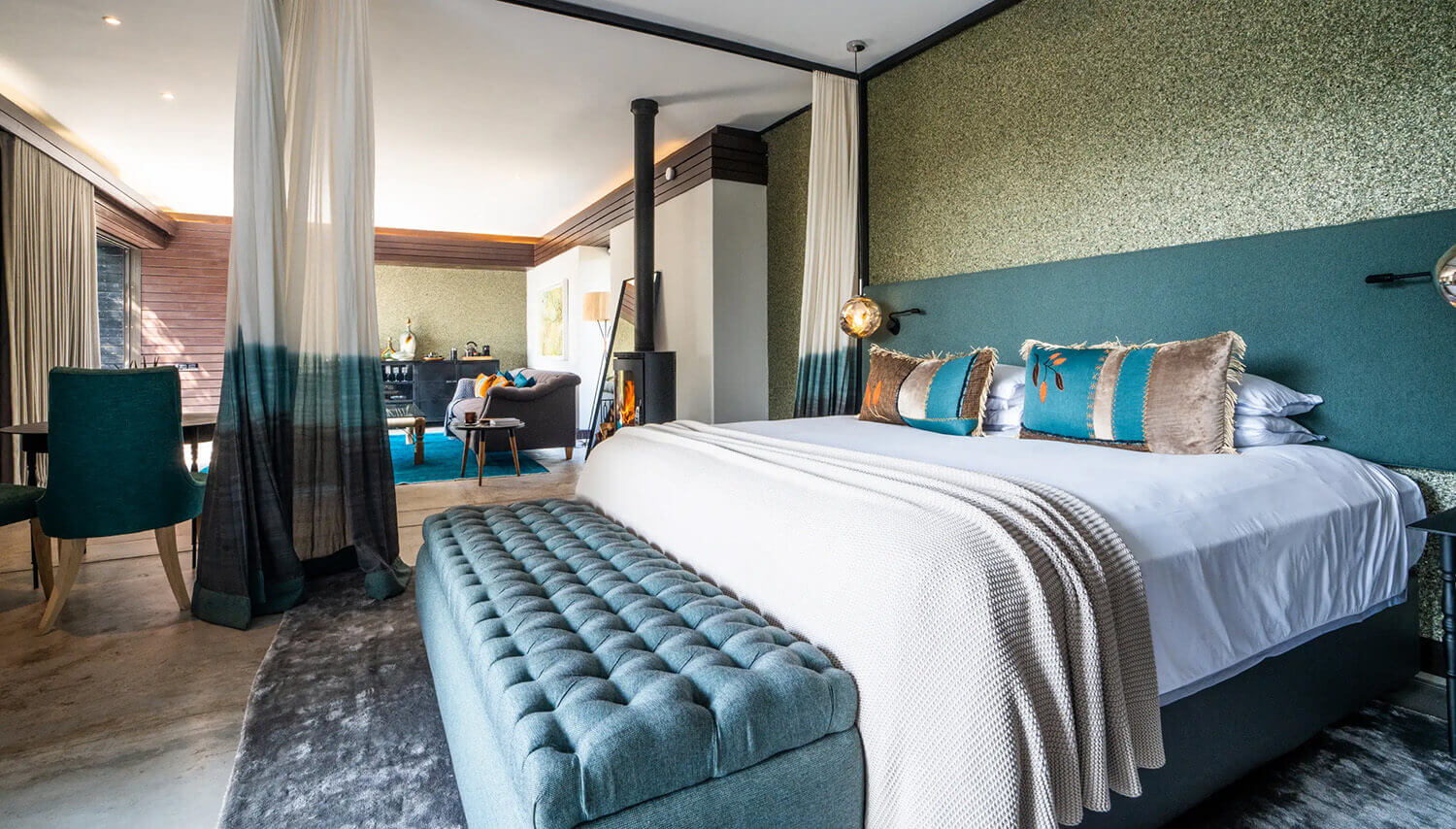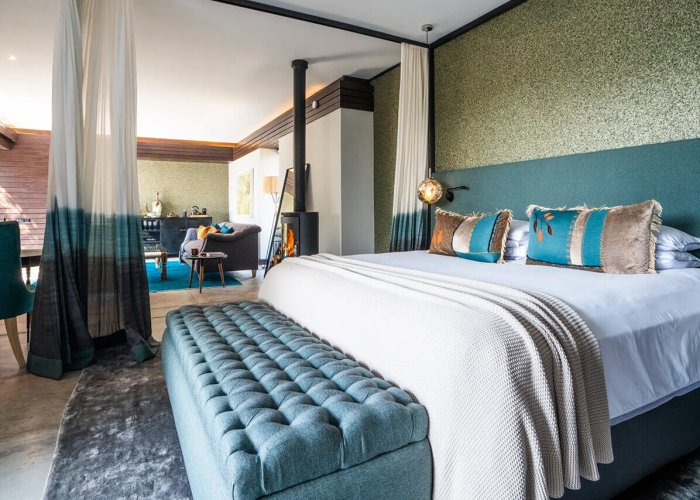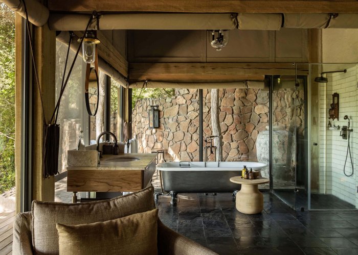 Sten-temat går att känna igen i de flotta sviternas inredning som innehåller mycket sten, men också brons, mjuka trädetaljer varvat med jordfärgade element och tyger i klara kulörer. Vardagsrummet är utrustat med en praktfull öppen spis, och det spatiösa sovrummet—med sin enorma säng—mynnar ut i ett generöst tilltaget badrum med inne- och utedusch. Utanför finner du ett stort trädäck begåvad med en liten plungepool och en fantastisk panoramautsikt ut över Sand River.